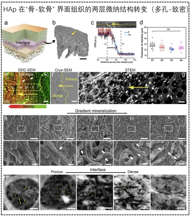 首先,本研究获取了20-50岁人的正常膝关节软骨样本,利用组织学及同步辐射断层扫描技术检测了骨-软骨界面处的宏观互锁结构,初步鉴定了“骨-软骨”界面组织的存在,利用SEM-EDX线扫描确定了界面20-30 μm的超薄梯度钙化区域,并进一步利用高分辨SEM、AFM、Cryo-SEM及STEM解析了界面的超微结构转变,及HAp的复杂组装,发现了界面从多孔结构逐渐转变为致密结构,同时,HAp在整个界面的形态从球形转变为多边形,最后变为类似骨的片层结构(图2)。形态的转变,意味着HAp组装的成熟。空间梯度分布的HAp有利于降低应力集中,促进力学传导。