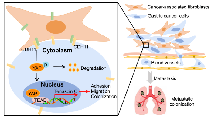 随后,研究人员通过建立体外细胞-细胞粘附模型、共培养模型、及体内共转移模型等,验证了CDH11介导了胃癌细胞与成纤维细胞之间的粘附互作,促进胃癌细胞的迁移、肿瘤球形成以及体内转移等恶性行为。机制上,研究人员阐释了CDH11介导的胃癌细胞与成纤维细胞的直接互作,能激活胃癌细胞YAP信号通路,促进YAP入核,上调Tenascin-C (TNC) 转录表达。多种挽救验证方法验证了YAP通路及靶基因TNC,参与了CDH11介导的成纤维细胞促胃癌细胞迁移、肿瘤球形成等恶性表型。