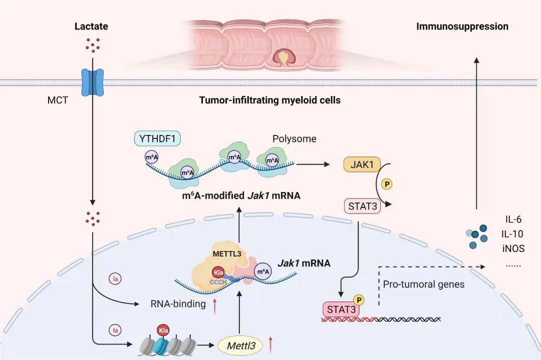 综上,本研究从“代谢-表观-转录”层面,揭示肿瘤微环境持续积累的乳酸如何促进METTL3表达和功能,以m6A修饰方式增强JAK1-STAT3枢纽信号活化,研究结果可能为靶向髓系细胞的肿瘤治疗策略提供新的启示。
