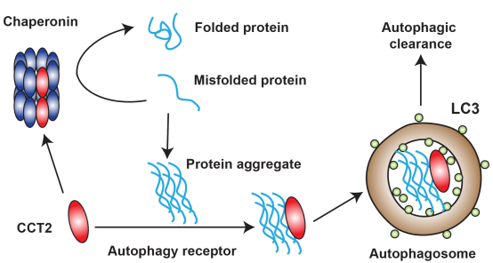 CCT2是分子伴侣Chaperonin复合体的一个亚基,与复合体一起作为分子伴侣帮助错误折叠的蛋白正确折叠。进一步研究发现,CCT2以单体形式介导聚集体自噬,因为只有单体形式的CCT2能够暴露出与LC3的结合位点VLIR 结构域。