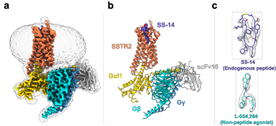 a,b.SS-14结合的SSTR2-Gi复合物的电镜密度(a)和结构模型(b)c.内源性多肽SS-14和小分子激动剂L-054,264的电镜密度和模型。