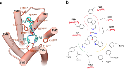 a.小分子配体L-054,264(青色)SSTR2(橙色)的结合模式。b.参与L-054,264选择性识别的SSTR2残基示意图。