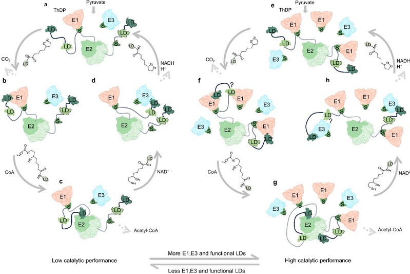 基于原位结构及外周亚基动态变化,研究者提出了新型的PDHc催化循环机制:在生理条件下,PDHc中的E1、E3和功能性LD的数量可动态协调,以适应不断变化的细胞代谢需求,实现高效灵活的能量转换。